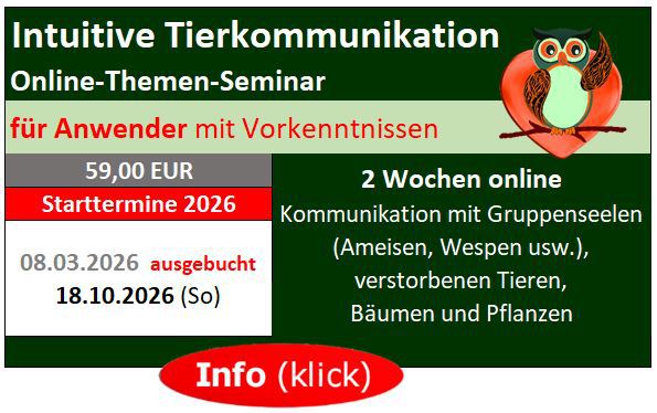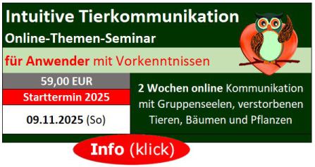 "Kommunikation mit der Gruppenseele von Tiervölkern/ mit Bäumen + Pflanzen/ verstorbenen Tieren/"