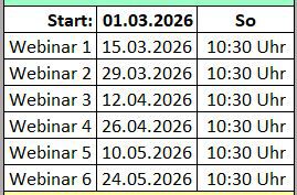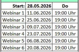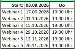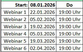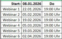 Nach Abschluss des Seminars kannst du auch im Nachhinein unbegrenzt an den Webinaren der dann laufenden Gruppen kostenlos teilnehmen.