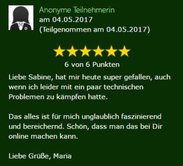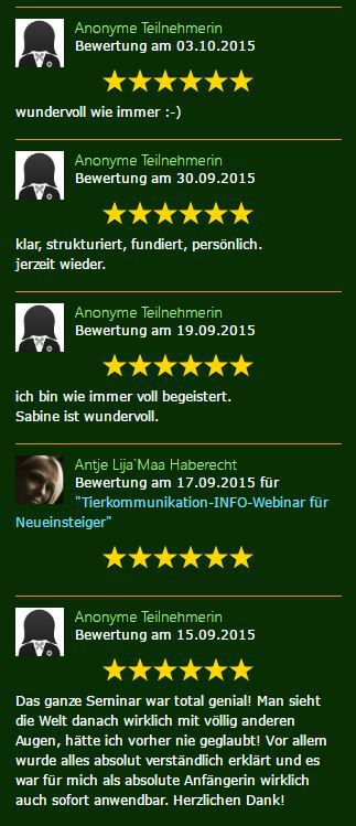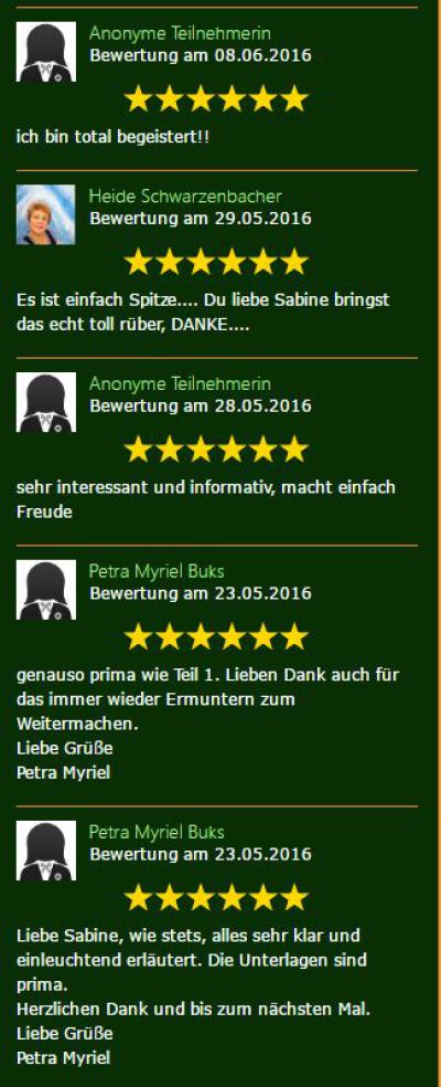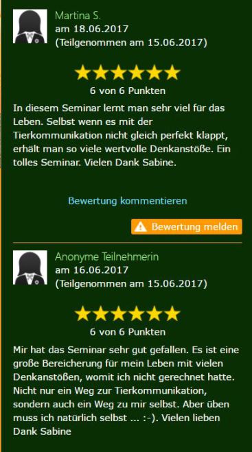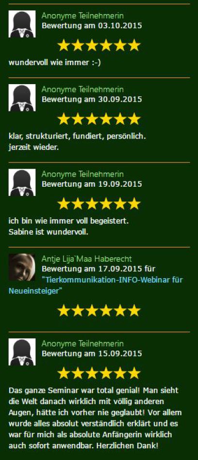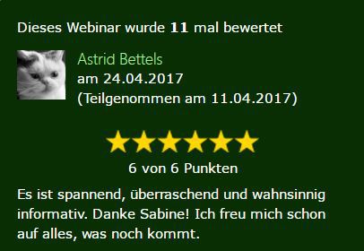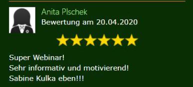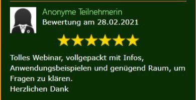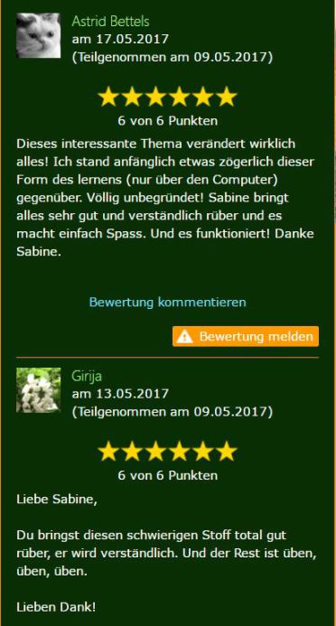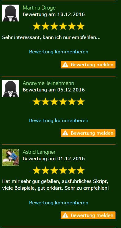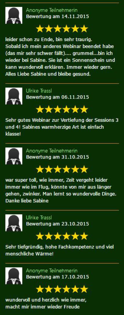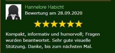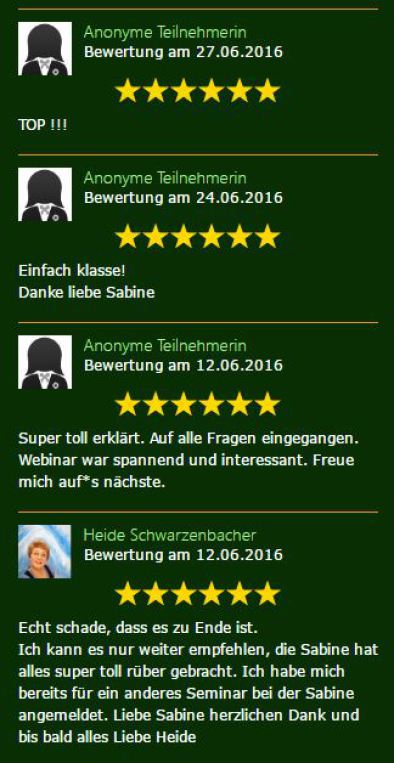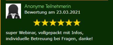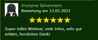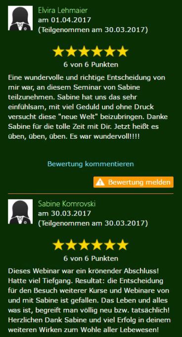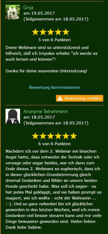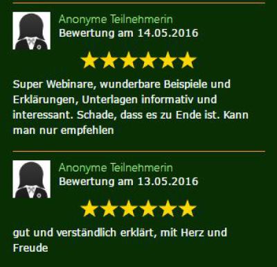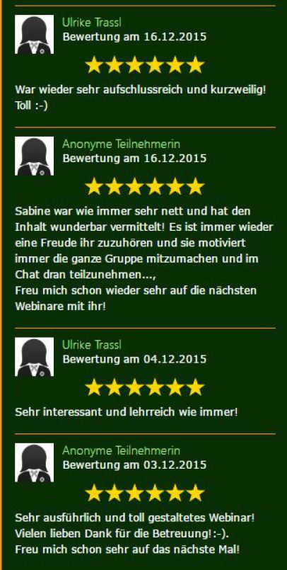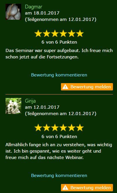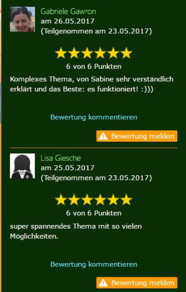 Die "grünen" Bewertungen sind von der Webinar-Plattform sofengo bzw. edudip. Die Namen der anonymen Teilnehmer/innen erscheinen erst nach dem Login.