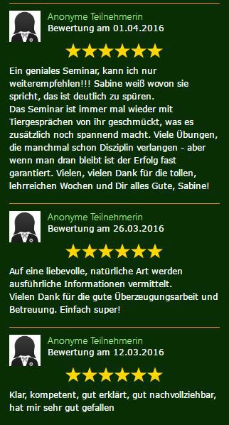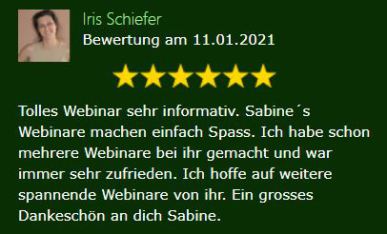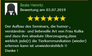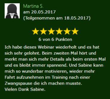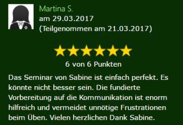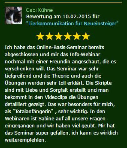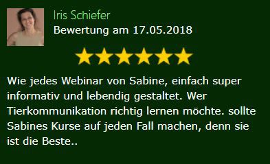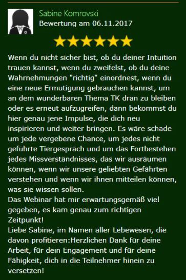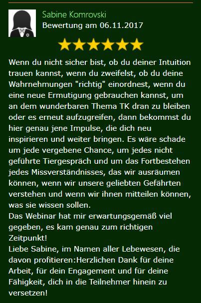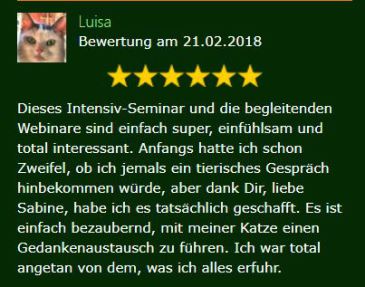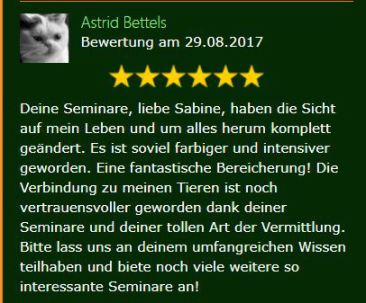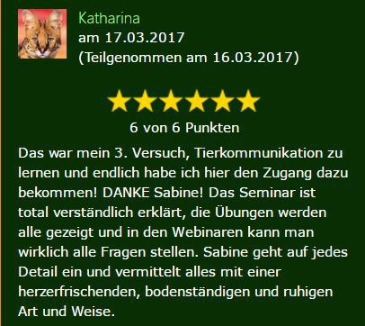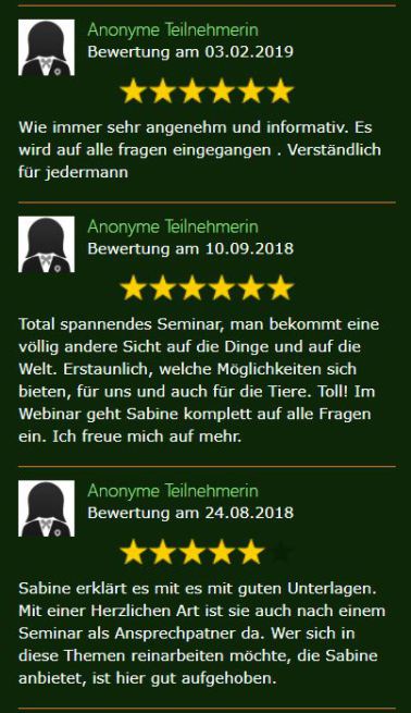 Das Seminar ist allen zu empfehlen, die sich mit diesem Thema befassen wollen. Es ist sehr gut und strukturiert aufgebaut. Auch wenn das Seminar beendet ist, man aber an irgendeiner Stelle nicht weiter gekommen ist, kann man sich die Seminarscripte und Videos herunter laden. Um dann in seinem eigenem Thempo alles noch einmal durchzugehen. Sabine hat dieses Seminar sehr gut aufbereitet und aufgebaut. Sie hat mir sehr geholfen, dass ich mein Tier besser verstehe und ich viel besser mit ihm kommunizieren kann. Ich bin sehr froh, dass ich dieses Seminar gemacht habe und danke dir, Sabine, für deine guten Ratschläge, Vorschläge und Hinweise die du in den Webinaren gegeben hast. Ich bleibe auf jeden fall dran. Es bereichert mein Leben um ein vielfaches. Ich danke dir sehr dafür.