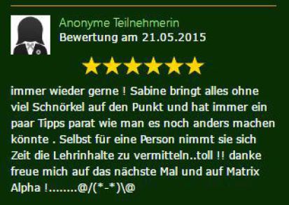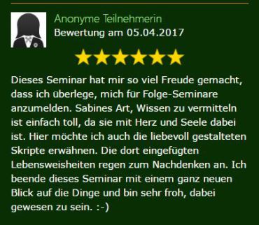 Ich hätte das Seminar schon viel früher besuchen sollen! Die Seminarzeit verging viel zu schnell, das Ambiente war sehr gut, meine Mitstreiterinnen "1a" und die Dozentin einfach nur "toll". Es macht Lust auf mehr!