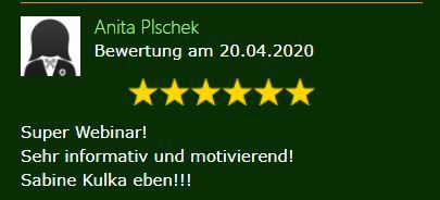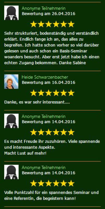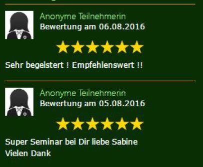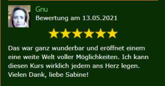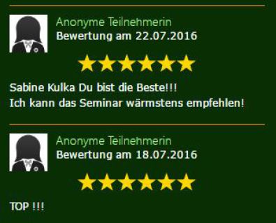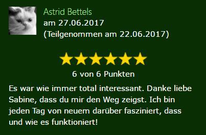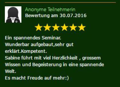 Ich danke Sabine Kulka aus tiefstem Herzen für dieses wunderbare, wundersame Seminar. Für mich hätte es nicht besser und passender sein können. Ich würde sofort wieder teilnehmen. Vielen, vielen Dank!