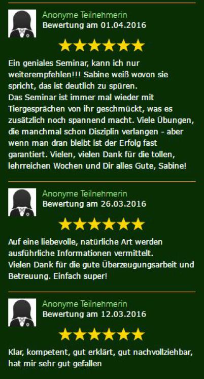 Liebe Sabine, vielen Dank für das intensive und sehr gut aufgebaute Seminar. Zwar war ich zu Beginn etwas skeptisch, was den Fernlehrgang angeht. Ich hatte weniger Unterstützung und weniger Details und Intensität vermutet. Doch ich war sehr, sehr positiv überrascht. Da ich vor einigen Jahren ein weniger erfolgreiches Wochenendseminar besucht hatte, hatte ich natürlich viel Hoffnung in Deines gesteckt. Positiv überrascht war ich über den sehr ausführlichen Einstieg. Zuerst werden die "verkümmerten" Sinne wiederbelebt. Dann wird Stück für Stück der Weg zu Kommunikation beschritten. Das fehlte mir tatsächlich in dem damaligen Wochenendseminar. Die Schulung der Wahrnehmung und der Sinne scheint mir sehr wichtig. Da ich während deines Seminars aber immer wieder kleine Erfolgserlebnisse erlebt habe, bin ich dieses Mal hochmotiviert, weiter zu üben und nicht wieder aufzugeben. Wer natürlich erwartet, dass sich auf Knopfdruck ein Ergebnis einstellt, hat allerdings schlechte Karten. Denn wie immer muss man einiges dafür tun und....üben, üben, üben...Schritt für Schritt...dran bleiben und nicht aufgeben. Ich fand das Seminar richtig klasse. Verbesserungsvorschläge kann ich tatsächlich nicht anbringen. So wie es ist, ist es genau richtig.