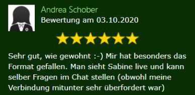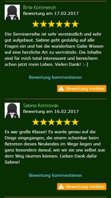 Ich habe mal ein kleines tief gehabt, weil ich nix gesehen habe, selbst da wurde ich Sabine aufgefangen und hat gleich mal nach meinem Einverständnis die Quantenheilung vollzogen. Es war total faszinierend. Ich kann dieses Seminar mit Sabine auf jedenfall weiterempfehlen.