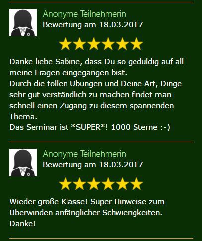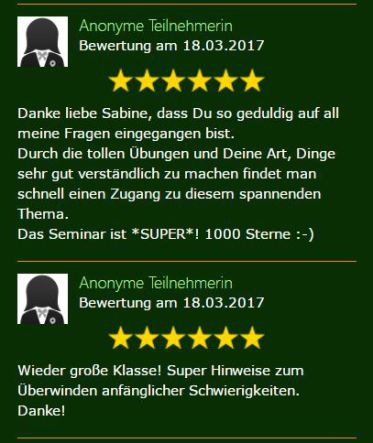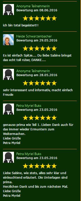 Liebe Sabine, was macht immer Spaß bei dir zu lernen! Du schaffst es die Inhalte einfach und verständlich rüber zu bringen und beantwortest geduldig unsere Fragen! Mir hat das Seminar großen Spaß gemacht! Jetzt heißt es aber üben üben üben :) alles liebe Katja