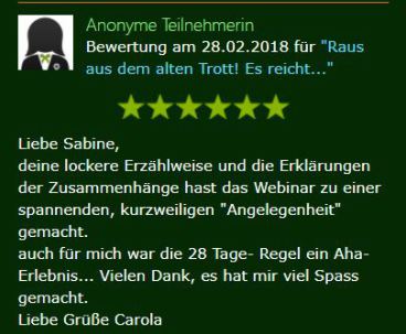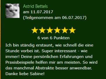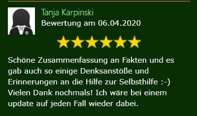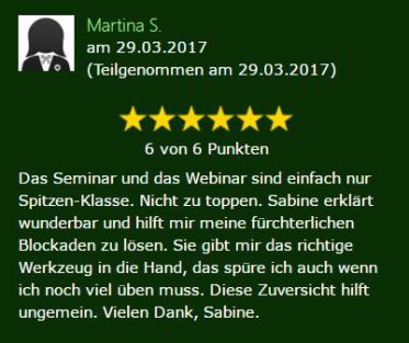 Liebe Sabine, ich war zuerst etwas skeptisch ob die Onlinekurse und Webinare der richtige Weg für mich sind. Aber ich fands gut erklärt mit vielen Beispielen und den Videos. Mir hat es geholfen, dass ich vorher, mit Hilfe von einem Buch, die 2Punktmethode schon ausprobiert hatte. Und kleine Erfolge stellen sich sehr schnell ein. Ich konnte so gut in meinem Tempo das Material durcharbeiten.