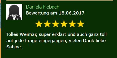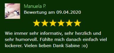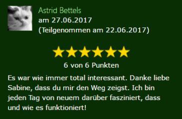 Ein großes Kompliment an Dich Sabine für das wundervolle, intensive und für mich sehr wertvolle Seminar in Erfurt. Ich habe schon viele Ausbildungen gemacht aber dieses Seminar "Quantenheilung in der Matrix/Tierkommunikation" hat alles übertroffen. Sabine gibt so viel von sich, nimmt einem die Unsicherheiten und zeigt immer wieder die Leichtigkeit in allen Dingen. Die uns zur Verfügung gestellten Arbeitsmaterialien sind sehr umfangreich und für jeden super verständlich. Das viele Üben war für mich besonders wichtig und hierfür war immer Zeit. Sabine hat eine Engelsgeduld und hat mich ganz besonders mit ihrer Empathie beeindruckt. Dieses Seminar kann ich von ganzen Herzen an alle Interessierten weiterempfehlen.