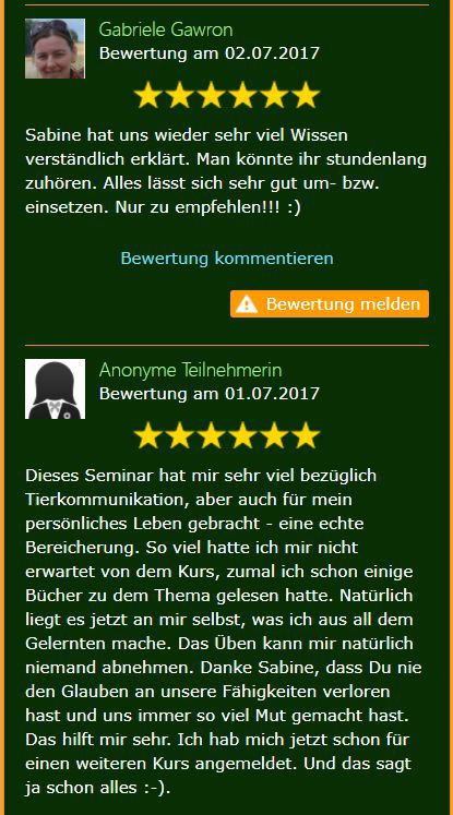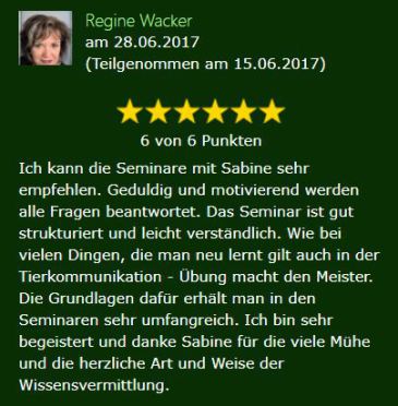 Das Seminar war einfach wunderbar. Sehr einfühlsam, strukturiert und so herrlich natürlich erklärt. Sabine hat die Fähigkeit, jeden dort abzuholen, wo er ist und ihn auf diesem wunderschönen Weg zu begleiten. Dass das alles funktioniert wusste ich bereits, die Ergebnisse der Übungen in der Tierkommunikation waren für alle und auch für mich erneut verblüffend.