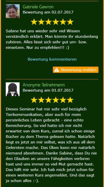 "Liebe Sabine. Dein Seminar "Matrix Quantenheilung für Tiere und intuitive Tierkommunikation" war ein sehr kompaktes und praxisorientiertes Seminar, welches mit absoluter Kompetenz, Empathie und hochwertigen, sehr gut aufbereitetem Seminarmaterial sowie liebevoll gestalteten zusätzlichen Inputs gefüllt war. Ich habe für meine Praxistätigkeit sehr viel dazulernen dürfen und bin dir sehr dankbar, dass du es so wundervoll, präzise und auf den Punkt vermittelt hast. Von sehr großer Bedeutung fand ich die kleine Seminargruppengröße, die ein individuelles Üben und Austauschen zu jeder Zeit zuließen. Ich kann dein Seminar und vor allem dich als Person aus tiefstem Herzen weiterempfehlen. Danke, dass es dich gibt und du dein Wissen, deine Erfahrungswerte und Fähigkeiten auf so beeindruckende Weise weitergibst. Ich wünsche dir auch weiterhin wissbegierige Seminarteilnehmer. Alles Liebe von Sandra"