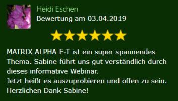 Ein sehr tolles, umfangreiches Onlineseminar. Mit Büchern wollte die Quantenheilung bei mir einfach nicht klappen, aber Dank des Kurses hab ich nun den Dreh raus und bin einfach nur begeistert über all die Möglichkeiten der Anwendung. Vielen lieben Dank Sabine.