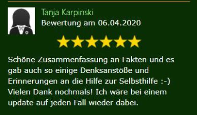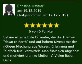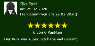 Es war ein spannendes Seminar mit Tiefgang. Viel Wissen super rüber gebracht. Gern wieder . Danke Frau Kulka