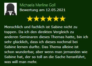 Es ist ein Seminar, welches wirklich ganz wunderbar aufgebaut ist, es gab genügend Zeit zum Üben, für alle Fragen hat Sabine sich Zeit genommen.