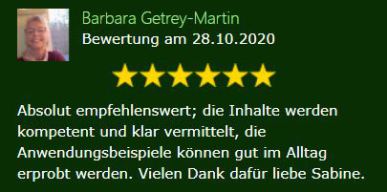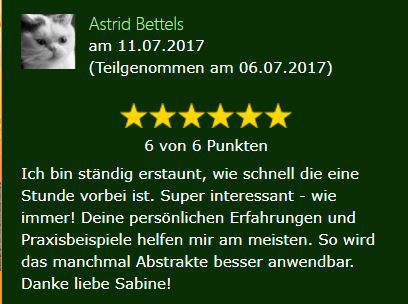 Das Seminar war großartig! Eine sehr große Bereicherung, unheimlich viel wertvolles Unterrichtsmaterial, Zeit eigene Themen und Fragen einzubringen, entspannte Atmosphäre, gerne etwas mehr praktisch Kommunizieren üben, ich würde das Seminar sofort wieder buchen und kann es uneingeschränkt weiterempfehlen. Sabine, du bist eine klasse!